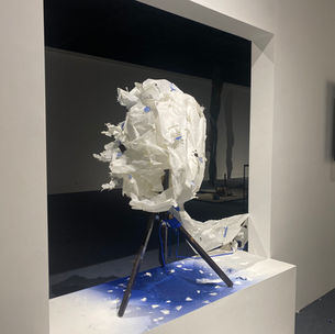 I collected sand from the shore and pour handfuls stained with ultramarine pigment through fragile rice paper hourglasses cut with video game explosions. What unfolds is a slow choreography of pouring, shaping, spilling, and restabilising: roles of care ripple outward, from the filmmakers who capture each crackle, to family members who prepare tea in the next room, to the sea breeze that shifts grains beyond human control. On screen, grains swirl in the air, paper curls into laser-kissed scars, and sculptural shards buckle under their own weight. These “sand timers” refuse to hold. They collapse, collapse again, and in their impermanence become portraits of touch that are intimate and elusive, mirroring the fleeting and flattening quality of digital contact. This work embodies the tension of holding, balancing hypervigilance in digital life with the demands of mothering and making, while foregrounding process as a sensual archive. Empty vessels scattered blue dust, and memories of hands no longer present hold space for the unseen: children drifting in and out of frame, subtle shifts in the studio, everyday care unfolding around me. Blue Bursts, Blue Kisses bridges digital and physical intimacy, offering a messy, porous space that reawakens embodied encounter in an always-on, ever-shifting world. The processual narrative appears in both Chinese and English, an intentional interruption that reflects my family’s bilingual conversations and our life lived between the UK and China. It offers glimpses of what lies just beyond the frame and deepens the work’s layered meaning.
